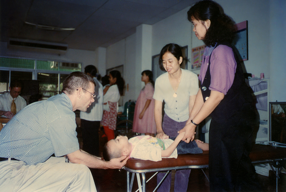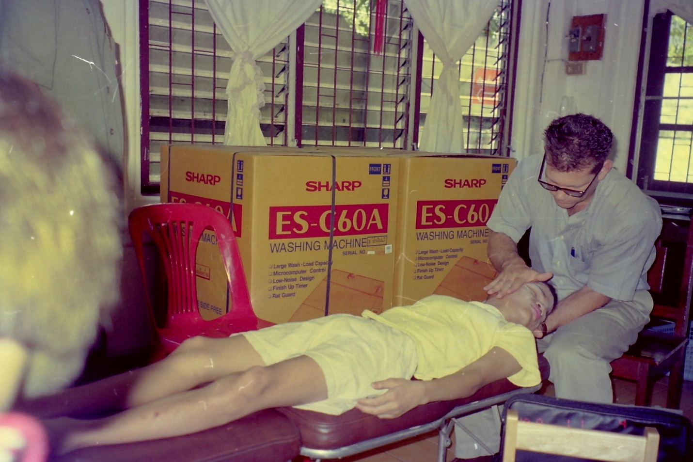 คุณหมอมาร์คในภาพด้านบนถ่ายที่มูลนิธิเพื่อเด็กพิการ กำลังทำการรักษาเด็กน้อยผู้พิการทางสมอง ที่นี่เป็นศูนย์กลางสำหรับเด็กที่ส่วนใหญ่มีฐานะยากจนจะนำเอาบุตรหลานของตนมารวมกันเพื่อทำกิจกรรมต่างๆระหว่างวัน โดยที่เด็กๆเหล่านั้นยังคงอาศัยอยู่กับครอบครัวของตัวเอง ผู้หญิงทางซ้ายมือเป็นแม่ของเด็กผู้ชายคนนั้นเอง ส่วนผู้หญิงฝั่งขวามือเป็นอาสาสมัครชาวไทยผู้อุทิศตนมาช่วยเหลือพวกเรา จากภาพคุณจะสามารถสัมผัสได้ถึงความอบอุ่นจากผู้ช่วยอาสาสมัครทุกท่านของเรา เป็นความงดงามของวิถีชีวิตแบบเดิมๆของชาวไทยที่ไม่เคยทอดทิ้งกัน